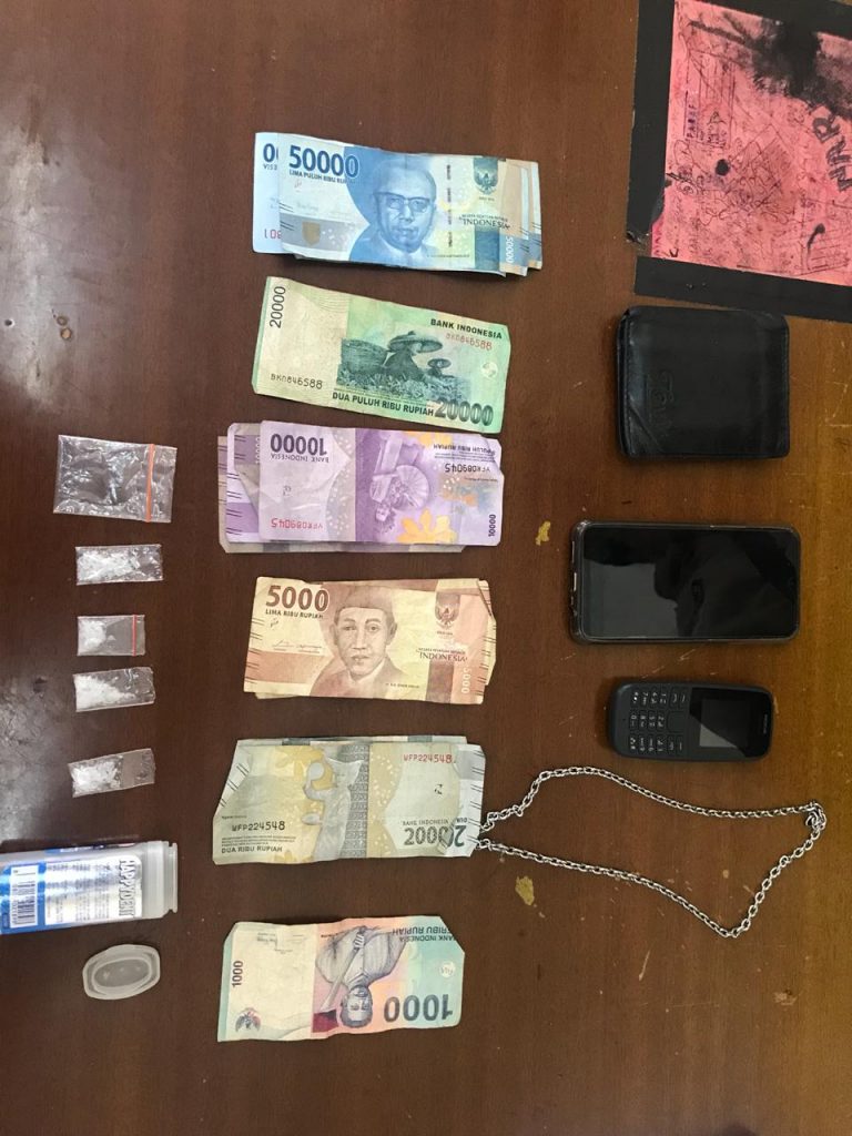 Adapun barang bukti yang disita dari para Tersangka 1 (satu) Buah Botol Plastik Permen Happydent warna putih berisi 1 (satu) bungkus plastik transparan klip merah yang didalamnya terdapat 4 (empat) paket/bungkus plastik transparan yang diduga berisikan narkotika jenis shabu dengan berat keseluruhan seberat 1,94 (satu koma Sembilan empat gram bruto )