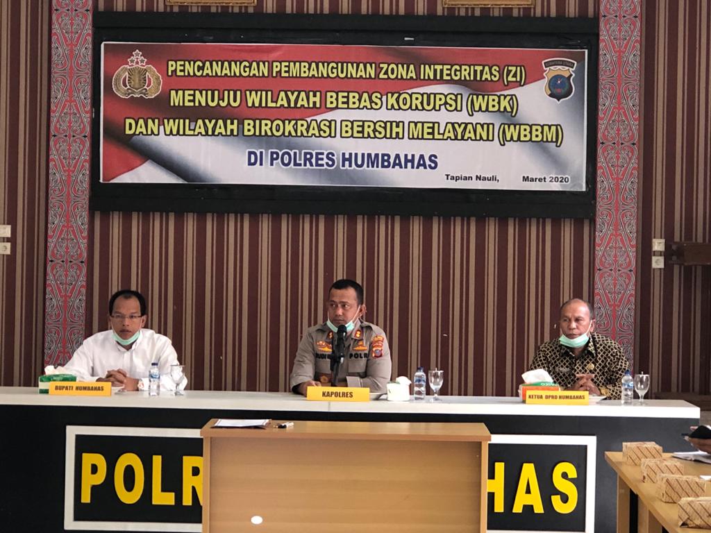 Acara tersebut diawali dengan kata sambutan Kapolres Humbahas AKBP RUDI HARTONO, S.I.K, MM yang menyatakan bahwa tujuannya mewujudkan kesungguhan Institusi Polri, khususnya Polres Humbahas dalam mengukuhkan diri sebagai Lembaga yang berkomitmen mencegah korupsi, kolusi, dan nepotisme serta wilayah bebas korupsi, reformasi birokrasi yang akuntabel.