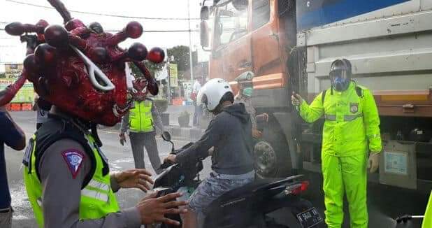 Pasuruan,Maspolin.id – Berbagai cara dilakukan polisi di Kota Pasuruan untuk mengingatkan masyarakat akan bahaya virus corona. Salah satunya dengan membuat helm menyerupai virus corona yang seram.