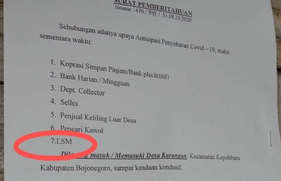 MASPOLIN || Bojonegoro – Ditengah pandemi virus Corona (Covid-19), Pemerintah Desa Karangan Kecamatan Kepohbaru memebuat Surat Pemberitahuan dengan nomor. 470/341/51.08.23/2020 tertanggal 29 Maret 2020 yang menyatakan sehubungan adanya upaya antisipasi penyebaran Covid-19, untuk sementara waktu Koperasi simpan pinjam/bank/plecit(titil), Bank Harian/mingguan, Debt Colector, Sales, Penjual keliling Luar Desa, pencari Kawol bahkan LSM pun dilarang masuk/memasuki Desa tersebut sampai keadaan kondusif. Surat Pemberitahuan tersebut ditandatangani kepala Desa Karangan Uswantoro.