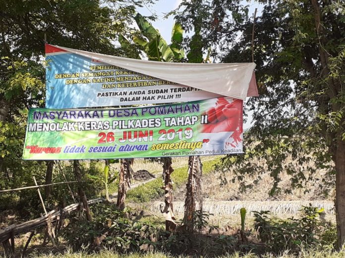Penolakan tersebut terlihat tampak pada Banner yang di pasang di beberapa tempat dan bertuliskan “MASYARAKAT DESA POMAHAN MENOLAK KERAS PILKADES TAHAP II PADA 26 JUNI TAHUN 2019 KARENA TIDAK SESUAI ATURAN SEMESTINYA”.