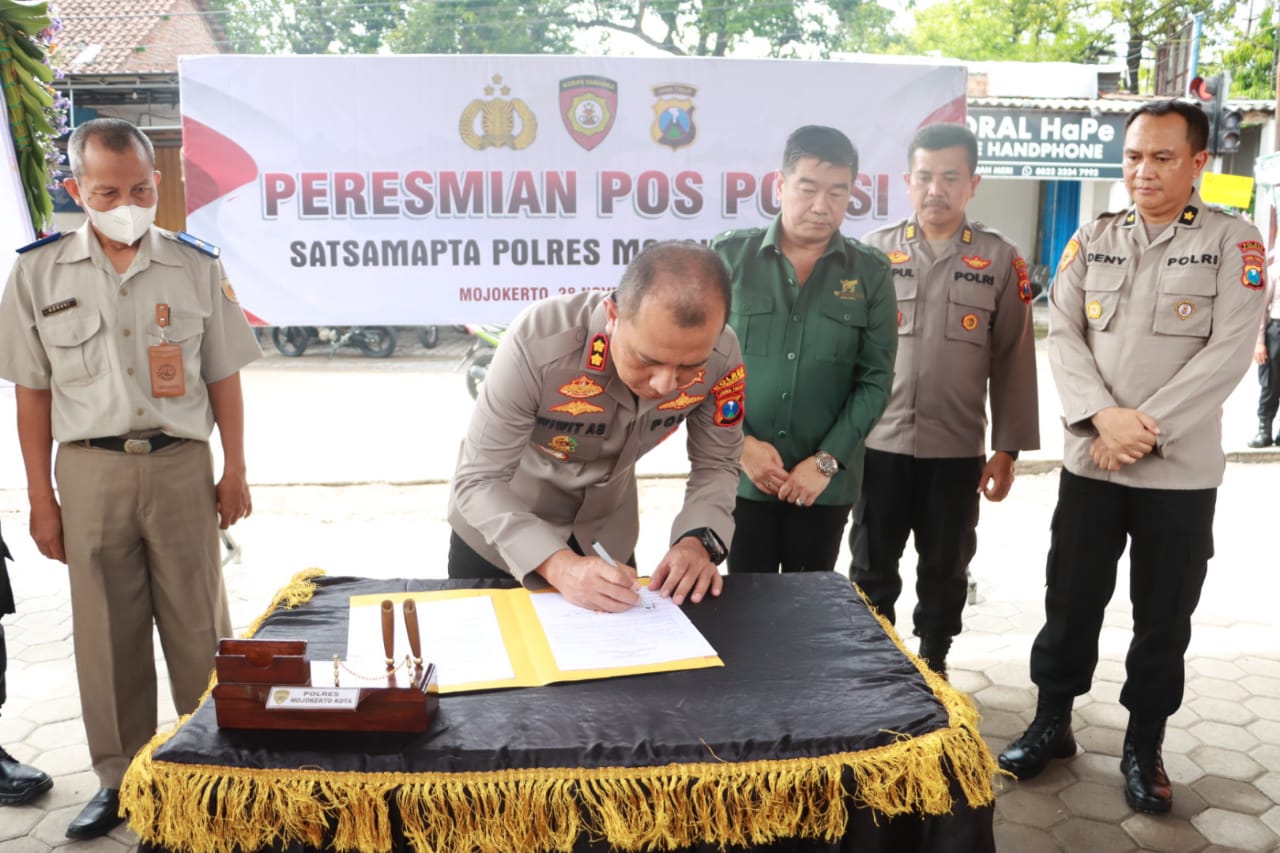 Peresmian Pos Polisi Samapta ditandai dengan penandatanganan prasasti dan pemotongan pita oleh Kapolresta Mojokerto AKBP Wiwit Adisatria, S.H., S.I.K., M.T. didampingi Presiden Direktur PT. Kitoshindo Ir. Sugianto, Perwakilan ATR/BPN Mojokerto dan Perwakilan dari KP Pratama Mojokerto serta pejabat utama Polresta Mojokerto, Senin (28/11/22).
