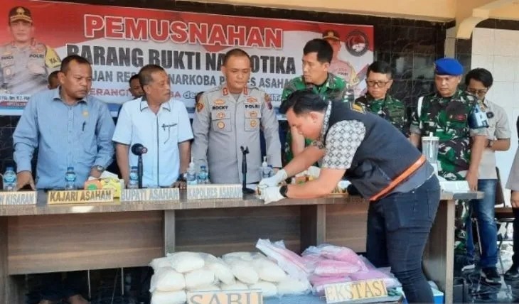 Asahan, SUMUT – Maspolin.id|| Kepala Kepolisian Resor (Kapolres) Asahan, AKBP Rocky Hasuhunan Marpaung, S.H., S.I.K., M.H., memusnahkan barang bukti narkoba jenis sabu dan pil ekstasi senilai puluhan miliar, yang ikut disaksikan oleh forum komunikasi pimpinan daerah (Forkopimda). Barang haram tersebut dimusnahkan dengan cara direbus serta di blender.