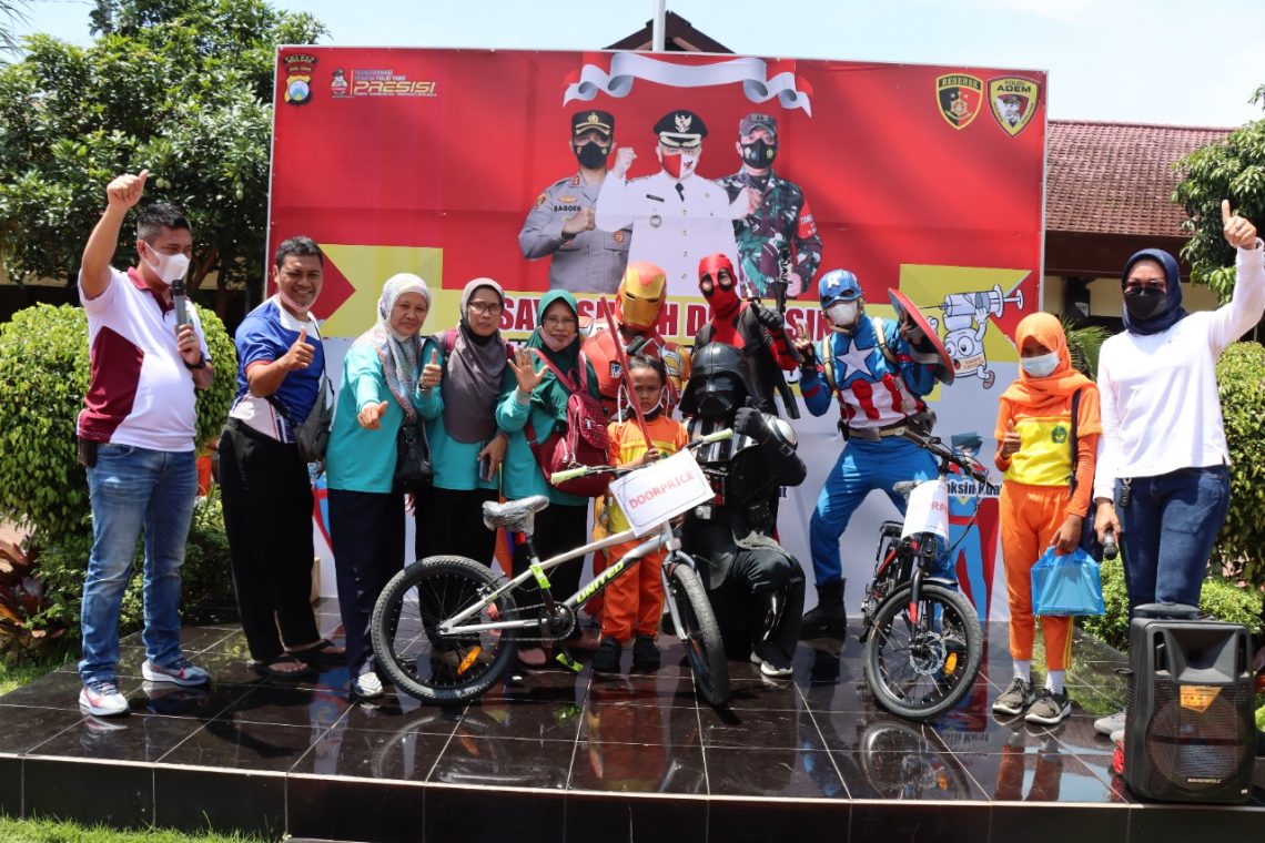“Suntik vaksin gak sakit kok, malah senang sekali karena dapat sepeda habis divaksin di Polres Malang,” kata Revan.