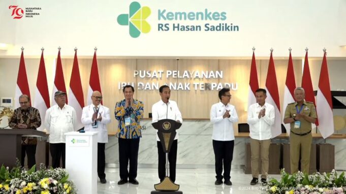 Maspolin.id|| Presiden Joko Widodo (Jokowi) meresmikan Gedung Pelayanan Kesehatan Ibu dan Anak Rumah Sakit Hasan Sadikin (RSHS) Kota Bandung, Provinsi Jawa Barat, Kamis (29/08/2024) siang. Presiden menyampaikan, gedung delapan lantai dengan kapasitas 490 tempat tidur ini diharapkan menjadi standar bagi rumah sakit lain di Indonesia.