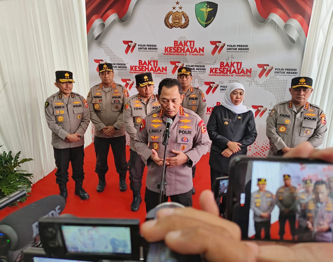 Lebih jauh Sigit mengungkapkan kegiatan Bakti Sosial Kesehatan ini merupakan bagian dari HUT Bhayangkara ke-77. Dia pun mengucapkan terima kasih kepada Gubernur Jatim serta rekan-rekan media yang telah menyiapkan tempat serta sinergisitas dari seluruh Forkopimda sehingga program bersama mewujudkan SDM unggul yang menjadi harapan pemerintah betul-betul bisa terwujud.