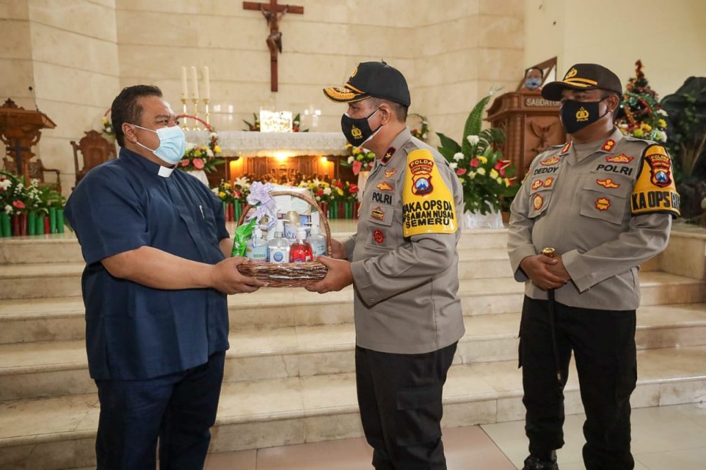 Dalam kunjungan ke Gereja Santo Yosep, Wakapolda Jatim memberikan Paket Prokes dan bingkisan untuk Gereja yang diterima Romo Drs. J.A.M Klooster, CM.