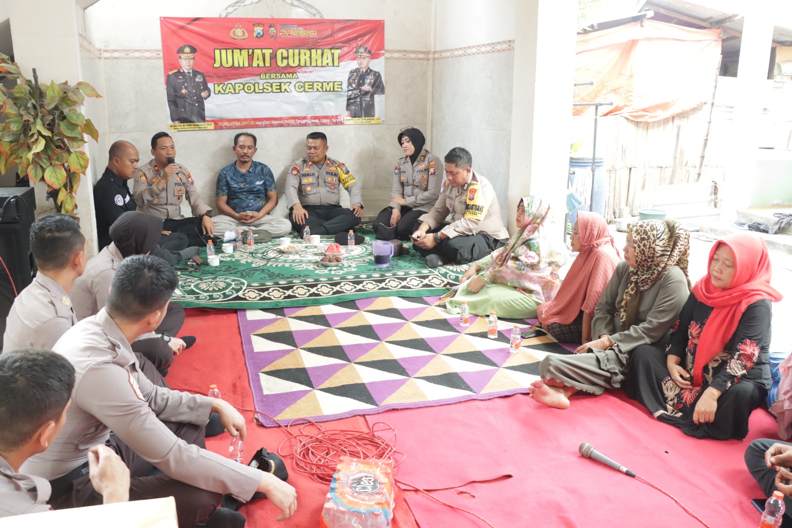 Selanjutnya Kapolres Gresik AKBP Adhitya Panji Anom melalui Kapolsek Cerme Iptu Andik Asworo mengatakan, dalam program jumat curhat dengan tujuan untuk menerima keluhan-keluhan terkait pelayanan Kepolisian terutama Polsek Cerme.