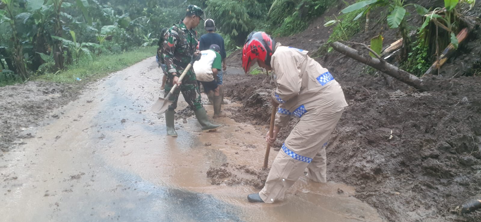 Selain itu longsor juga membuat sejumlah pohon di bibir jalan tumbang ke jalan yang merupakan akses kedua desa.