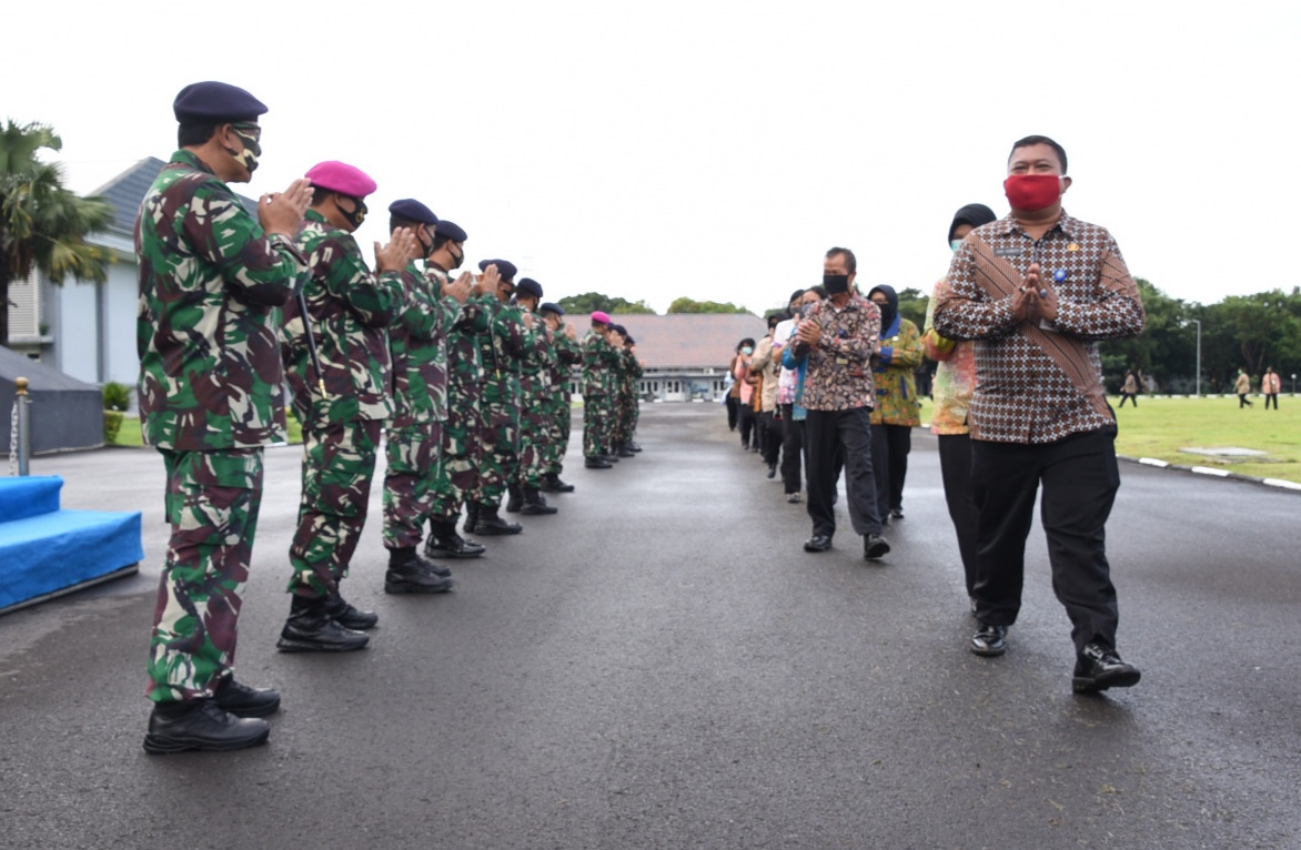 MASPOLIN || Surabaya – Berkait pandemi Covid-19 menjadijkan tradisi Halal Bihalal Idul Fitri tahun ini berbeda dari tahun sebelumnya, seperti yang dilakukan personel Akademi Angkatan Laut (AAL) yang melakukan hal tersebut tanpa berjabat tangan usai apel pagi di Lapangan Banda, Mako AAL, Bumimoro, Surabaya, Jumat (29/5).