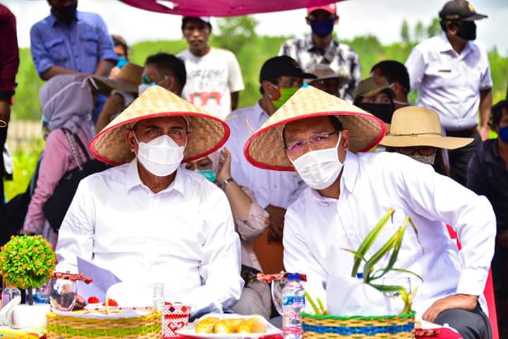 Suasana masih ditempat yang sama, Gubsu dan rombongan melakukan penanaman bawang merah di lahan milik kelompok tani Peasigaol. Pada saat kunjungan Gubsu tersebut dirangkai dengan pemberian bantuan sosial berupa sembako untuk petani.
