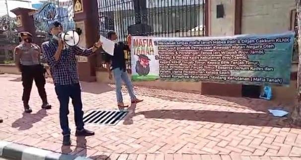 Hadi Prabowo Kordinatortor Lapangan mengatakan dalam orasinya bahwasannya isu Dugaan Tindak Pidana Perambahan Kawasan Hutan, dan alih Fungsi Kawasan Hutan menjadi Perkebunan Kelaapa Sawit Tanapa Izin yang dilakukan Oleh para mafia tanah (PT.MPG), bukan lagi menjadi Rahasia Umum, namun semua intansi seperti Dinas Kehutan Provinsi Jambi terkesan tutup mata dan tutup telinga seakaan tak mengetahui persoalan yang sebenarnya.