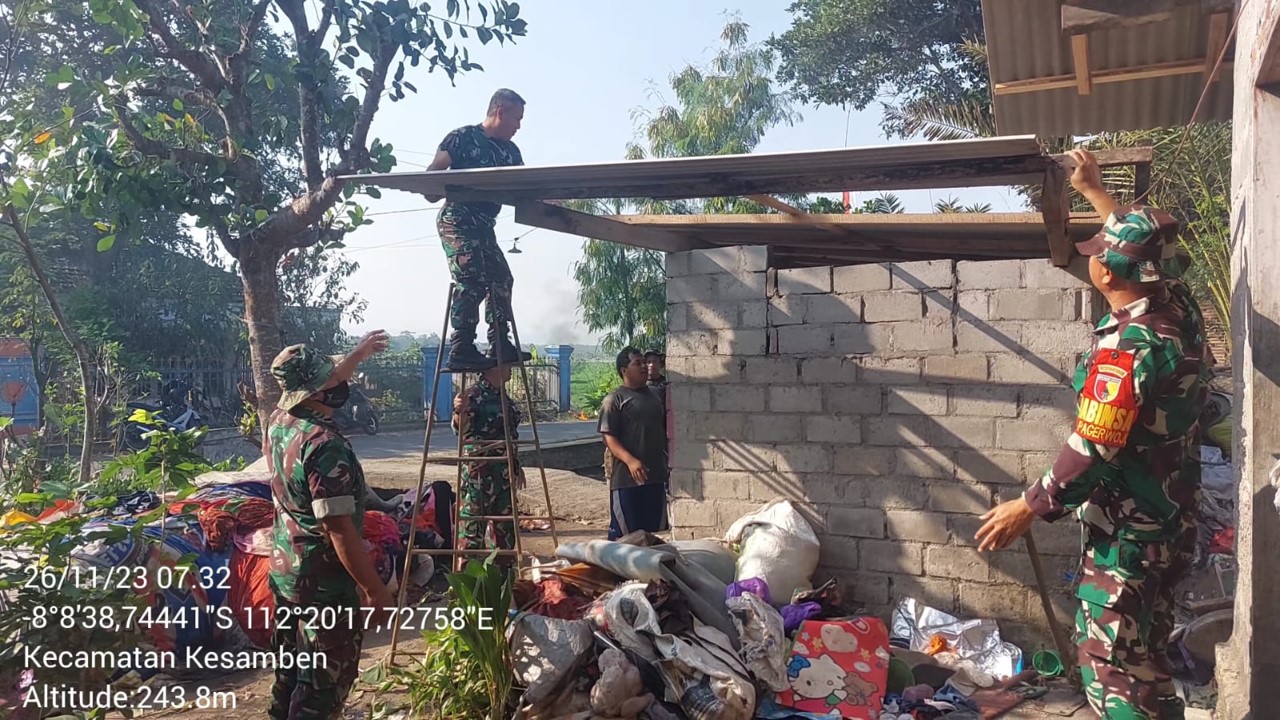 Anggota Koramil Kesamben menunjukkan komitmennya dalam membantu warga masyarakat, dengan turut serta dalam kegiatan memperbaiki rumah warga yang membutuhkan bantuan.