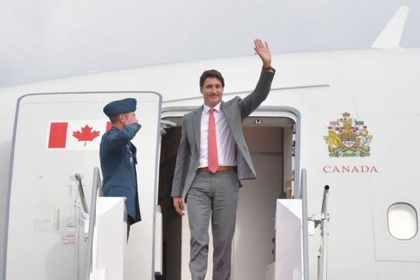 Ia lalu keluar dari pintu pesawat sekitar pukul 11.55 WIB didampingi putra sulungnya Xavier Trudeau.