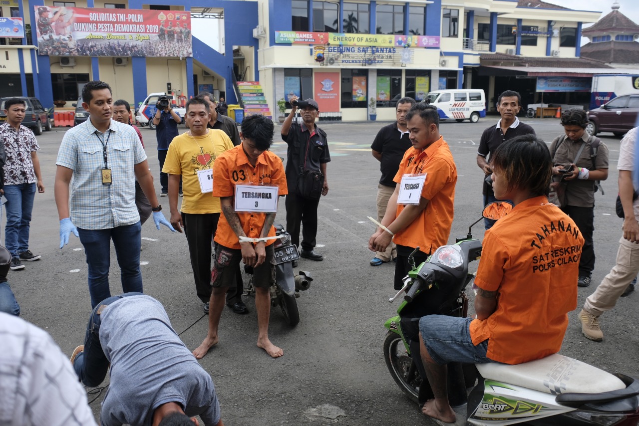 Dalam gelar perkara di Mapolres Cilacap, Jumat (1/2/2019), Kapolres Cilacap AKBP Djoko Julianto melalui Kasat Reskrim AKP Onkoseno Grandiarso Sukahar mengatakan, keempat pelaku tersebut berinisial AK (24), PR (19), dan CH (21), ketiganya warga Desa Cinangsi, Kecamatan Gandrungmangu, Cilacap, dan satu orang lagi IA (24), warga Desa Karanggintung, Kecamatan Gandrungmangu, Cilacap.