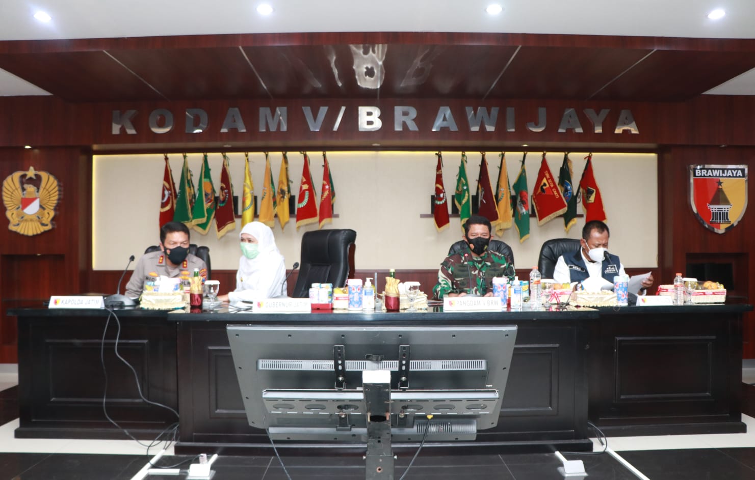 MASPOLIN || SURABAYA,- Forkopimda Jawa Timur, Gubernur Jatim Khofifah Indar Parawansa, Pangdam V Brawijaya Mayjen TNI Suharyanto, Kapolda Jawa Timur Irjen Pol Nico Afinta, Wali Kota Surabaya Eri Cahyadi dan Bupati Bangkalan R Abdul Latif Amin Imron serta stake holder terkait, Rabu (23/6/2021) malam menggelar Rapat Koordinasi Percepatan Penanganan Covid-19 di Kabupaten Bangkalan, yang dilaksanakan di Ruang Bina Yudha, Makodam V Brawijaya.
