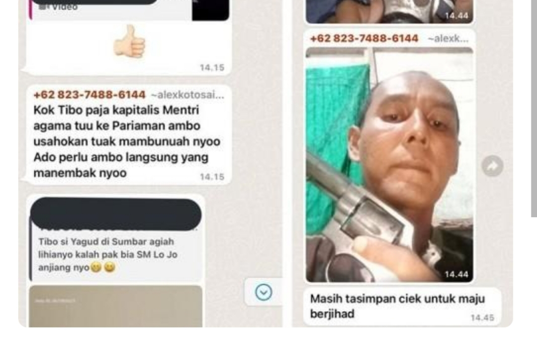 Dalam grup chat tersebut, Alex Koto menulis: “Kok tibo paja kapitalis mentri agama tuu ke pariaman ambo usahokan tuak membunuah nyoo Ado perlu ambo langsung yang manembak nyoo.”