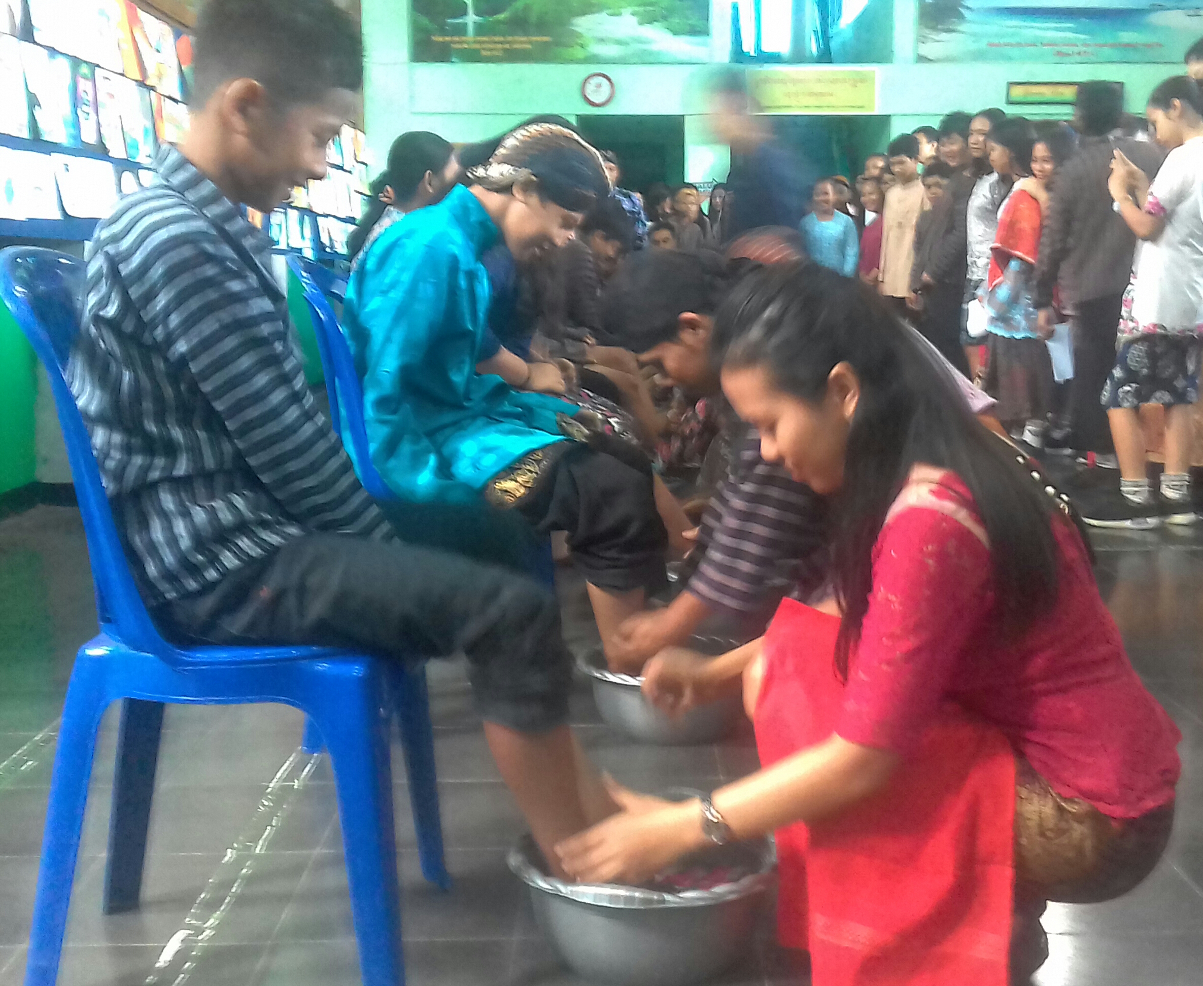 Sejumlah guru tampak membasuh kaki para murid, juga murid membasuh kaki gurunya secara bergantian.
