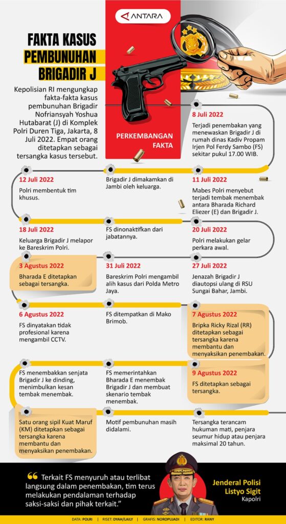 Kepolisian RI mengungkap fakta-fakta kasus pembunuhan Brigadir Nofriansyah Yoshua Hutabarat (J) di Komplek Polri Duren Tiga, Jakarta, 8 Juli 2022. Empat orang ditetapkan sebagai tersangka kasus tersebut.