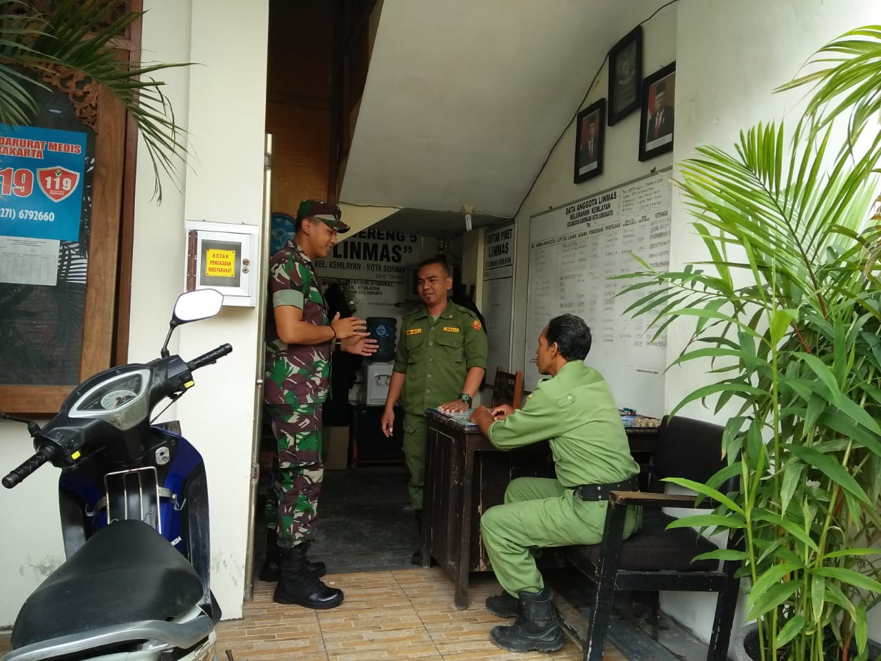 Begitu juga yang di lakukan Babinsa Kel Kemlayan Koramil 03/Serengan Kodim 0735/Surakarta, Serka M Nur Hakib pada hari Kamis 9 Januari 2020, Melaksanakan komsos bersama Lurah dan Linmas Untuk mempererat tali silaturahmi dan kerjasama yang baik dalam rangka mendukung Tugas Pokok Babinsa serta terwujudnya Kemanunggalan TNI dengan Rakyat,