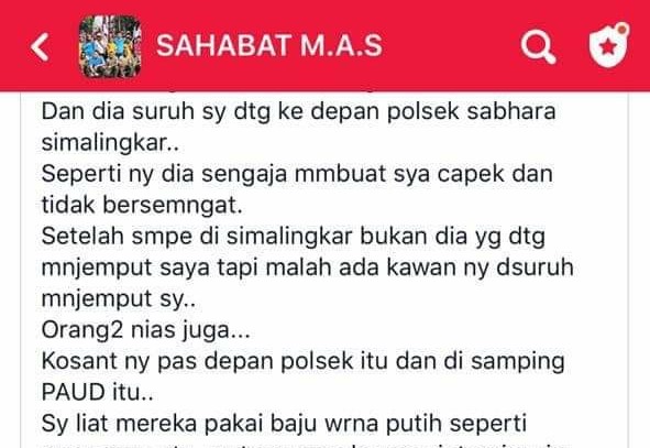 Sang pelaku memberikan arahan kepada penulis agar datang ke depan Mapolsek Simalingkar. Ternyata disana sang penulis telah ditunggu oleh teman dari pelaku yang juga orang nias.