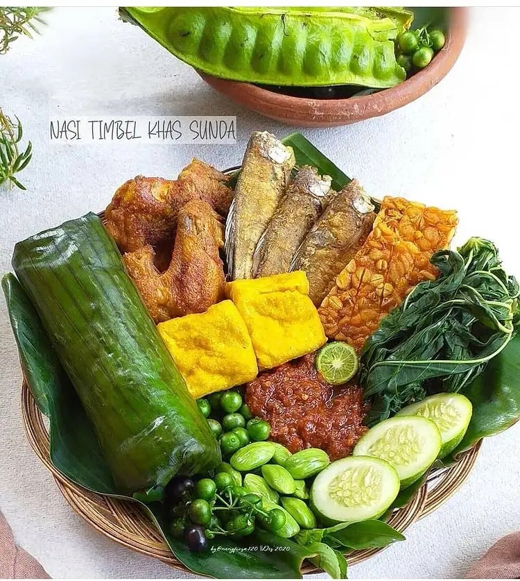Nasi timbel menggunakan bungkusan daun pisang dan disajikan bersama lauk, seperti ikan, ayam goreng, sampai daging. Tidak lupa, lalapan dan sambal sebagai pelengkap.