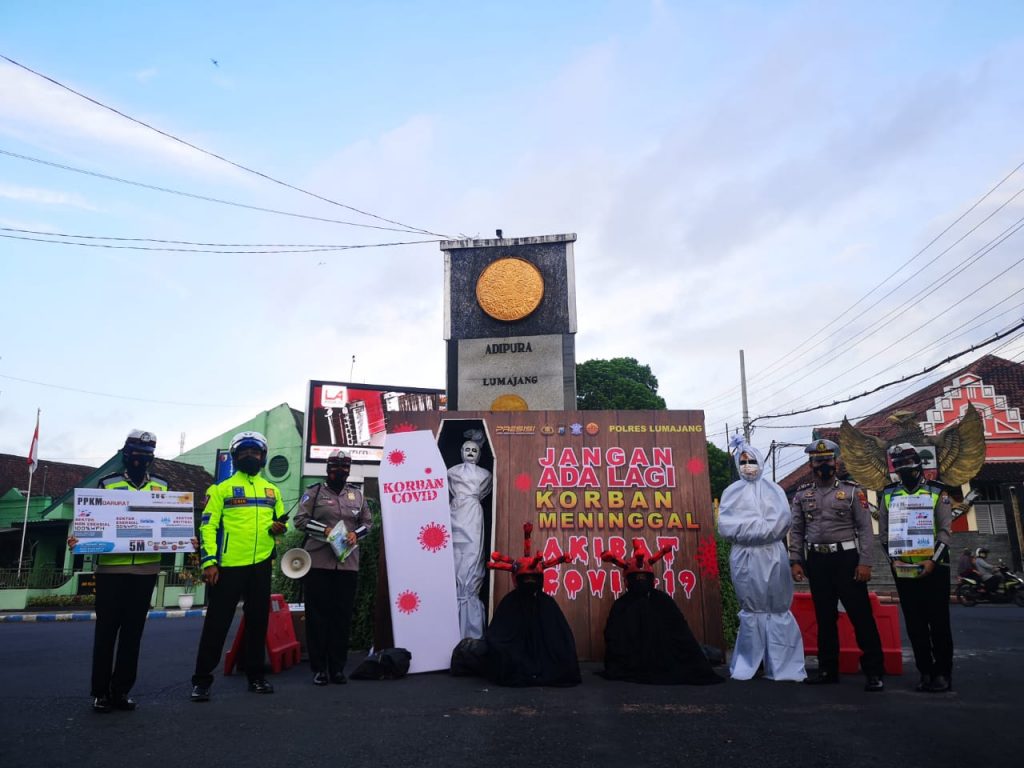 Kasat Lantas Polres Lumajang AKP Bayu Halim Nugroho berkata, hal itu sebagai bentuk imbauan kreatif, diharapkan menggugah kesadaran masyarakat, dan berdampak pada percepatan penanganan yang berujung pada pengendalian penularan Covid – 19.