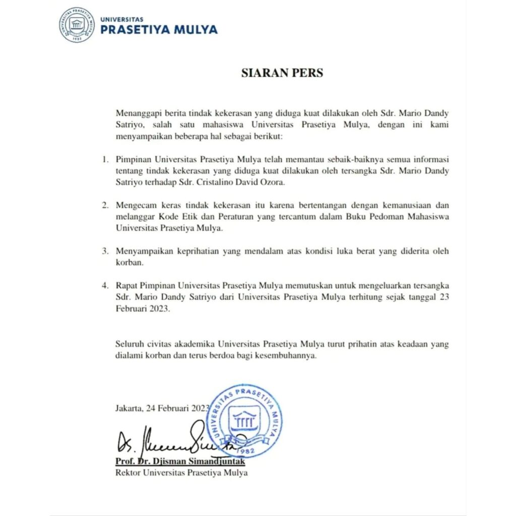 Dalam siaran pers, Jumat (24/2/2023) yang ditandatangani Rektor Universitas Prasetiya Mulya Prof. Dr. Djisman Simandjuntak, pimpinan Universitas Prasetiya Mulya mengakui Mario Dandy Satriyo, salah satu mahasiswa Universitas Prasetiya Mulya.