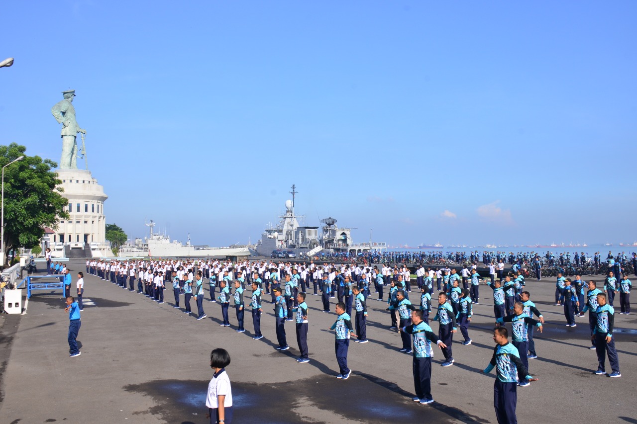 Ada yang istimewa kali ini, setelah sampai di Dermaga Ujung, rombongan gowes Lantamal V bergabung dengan rombongan Pangkoarmada II yg juga sebelumnya melaksanakan gowes bareng Perajurit Koarmada II mengelilingi DBAL. Untuk melaksanakan Senam dan Joged Poco-poco bersama Prajurit Koarmada II.