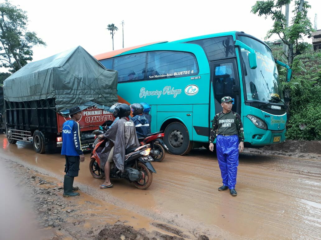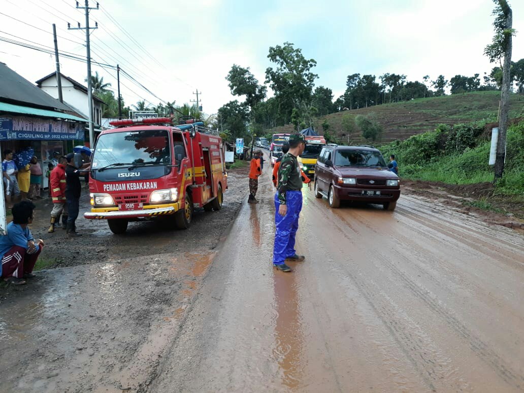 Babinsa Koramil 13/Majenang Sertu Darsono bersama instansi terkait langsung melakukan penanganan akibat tanah longsor, mengatur arus lalu lintas di jalan penghubung yang merupakan area Perhutani di Dusun Cipabeasan, Desa Cilopadang, Senin (6/1/2020).