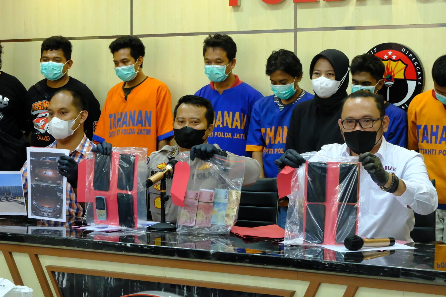 Dari tangan tersangka, polisi menyita barang bukti 8 unit ponsel, 72 sak gula ravinasi, truk tronton merah L 8875 UA, mobil Honda Mobilio dan uang tunai Rp 21.345.000.