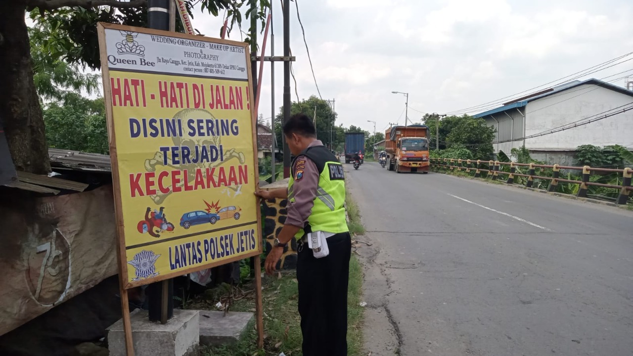 Mojokerto – Maspolin.id|| Mengantisipasi Tinnginya angka kecelakaan Lalu Lintas Menjelang Natal dan Tahun Baru 2023 (Nataru), Polsek Jetis Polresta Mojokerto Polda Jatim melakukan pemasangan banner peringatan jalur rawan atau Black Spot di sepanjang jalan provinsi utara sungai brantas, Rabu (13/12/22)