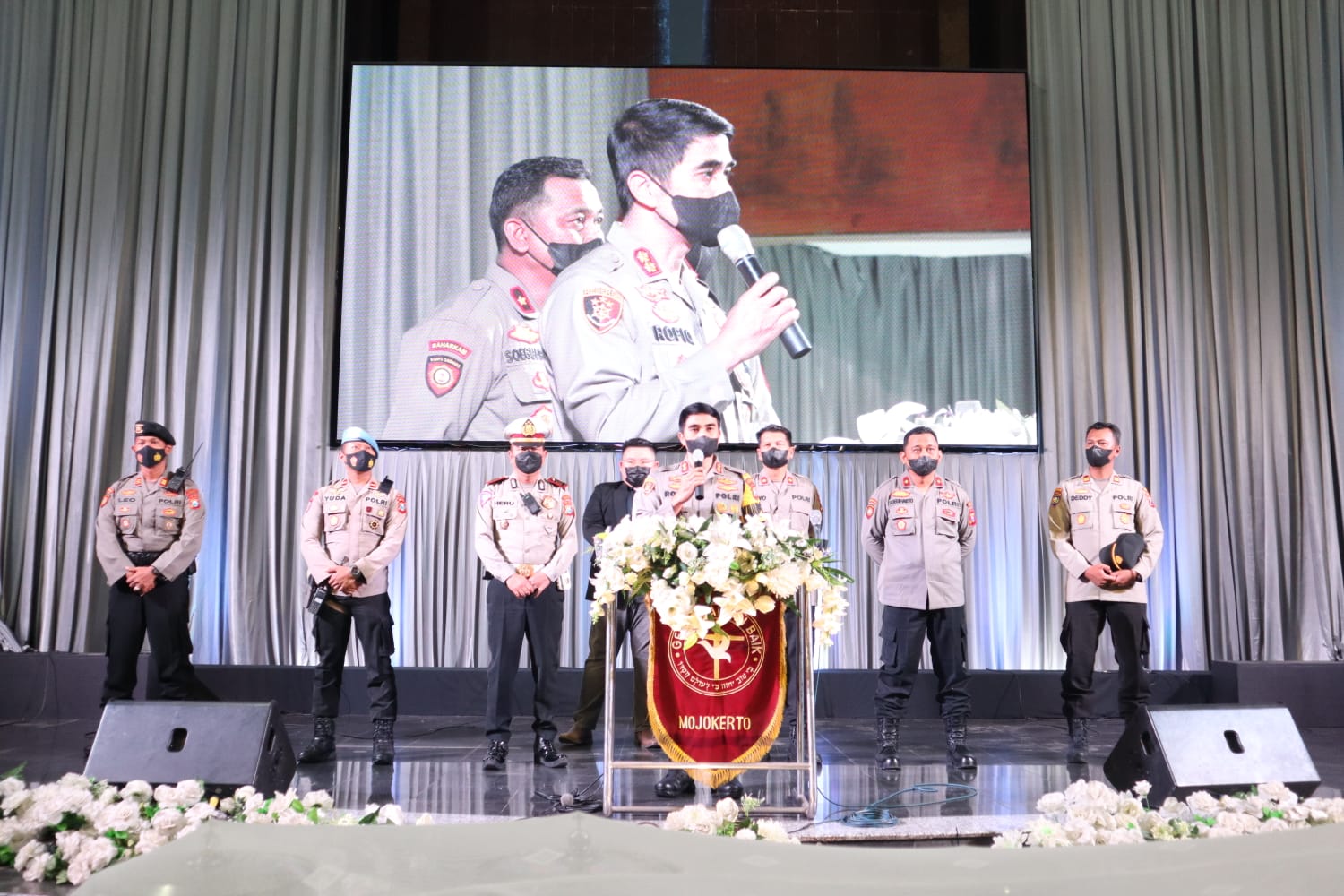 Pendeta memberikan kesempatan Kapolresta Mojokerto, AKBP. Rofiq Ripto Himawan menyapa para jemaat gereja yang saat itu mengikuti ibadah dengan mengucapkan selamat menyambut perayaan wafatnya Isa Almasih juga perayaan Hari Raya Paskah hingga hari Minggu di podium (altar) gereja.