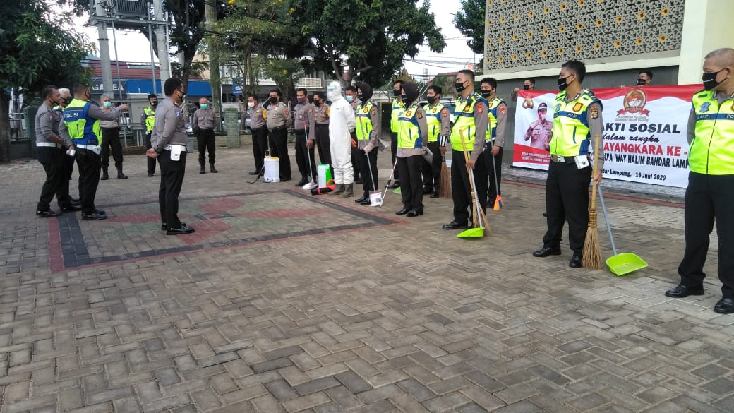 Kasat Lantas Polresta Bandar Lampung Kompol Reza Khomeini, mengatakan, bakti sosial yang dilakukan dalam bentuk pembersihan lingkungan Masjid dan penyemprotan disinfektan.
