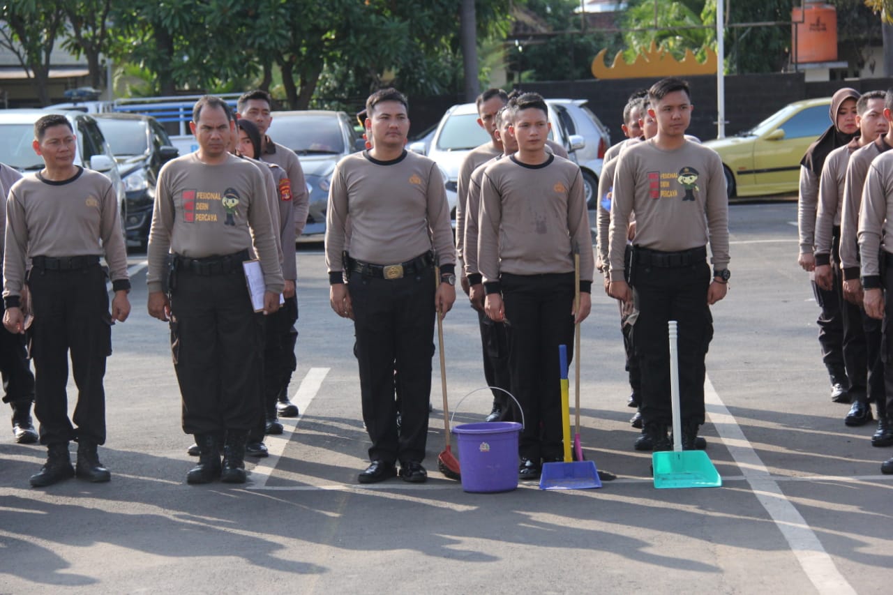 Lampung,Maspolin.id – Tampak berbeda pada pelaksanakan apel pagi di Mako Polresta Bandar Lampung, ini terlihat dari seluruh personil membawa peralatan kebersihan mulai dari sapu, ember maupun gunting rumput.