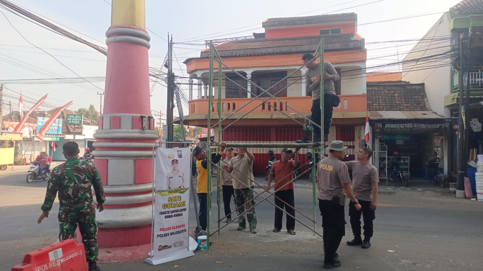 Mojokerto – maspolin.id II Menjelang perayaan Hari Ulang Tahun Kemerdekaan Republik Indonesia yang ke-79, Polsek Dlanggu dan Koramil Dlanggu melakukan gotong royong pengecatan ulang Tugu Peluru yang berada di pertigaan Pasar Tanjung Sari, Sabtu (10/8/2024).