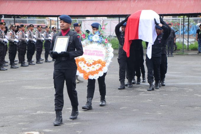 JAYAPURA – Maspolin.id|| Jenazah personel Brimob Ops Damai Cartenz yang menjadi korban dalam kontak tembak dengan Kelompok Kriminal Bersenjata (KKB), Briptu Rudi Agung Ashari, diberangkatkan ke kampung halamannya, Manado. Upacara pemberangkatan pun dilaksanakan dengan dipimpin Wakapolda Papua Brigjen. Pol. Ramdani Hidayat.