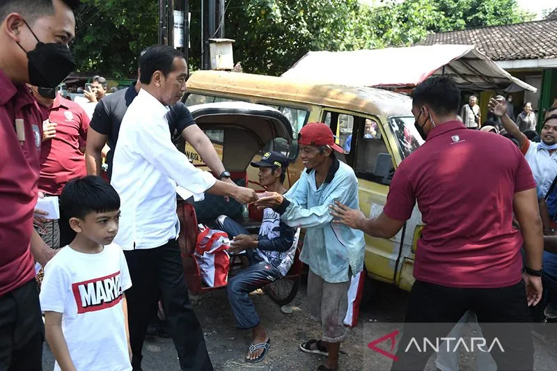JAKARTA (ANTARA) – Maspolin.id|| Presiden Joko Widodo bersama Ibu Negara Iriana membagikan bantuan untuk pedagang di sejumlah pasar di Surakarta, Jawa Tengah, Minggu.