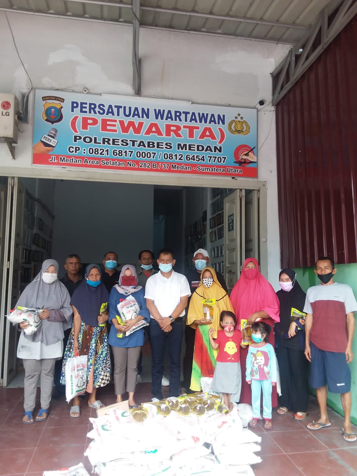 Didampingi anggota Zak Ahmadi, Bardansyah, dan Surya Irwandi Hasibuan, Ketua Pewarta Polrestabes Medan Chairum Lubis, SH menyerahkan sembako dengan tetap mematuhi protokol kesehatan yang dianjurkan pemerintah.