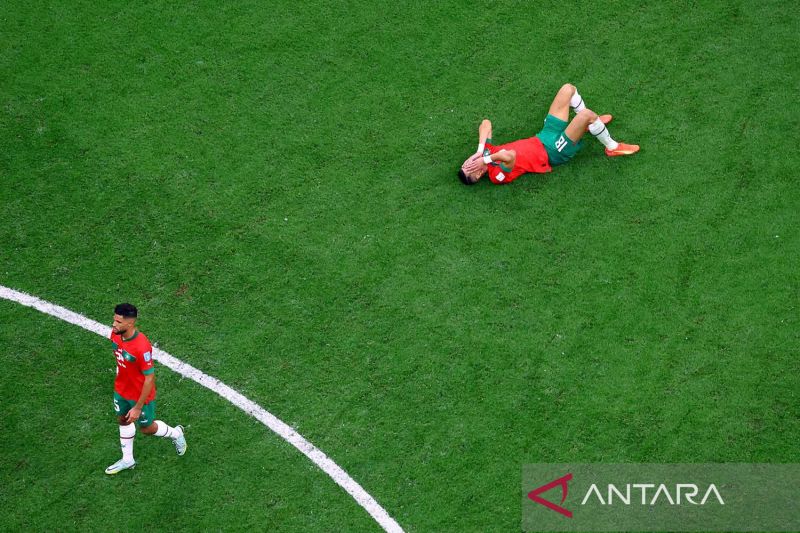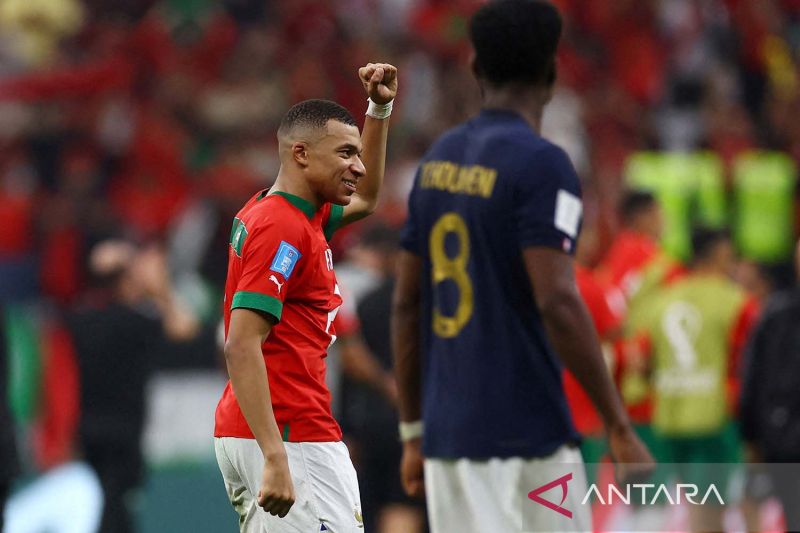 Pemain Maroko Jawad El Yamiq menendang bola saat pertandingan semi final Piala Dunia 2022 melawan Prancis di Al Bayt Stadium, Al Khor, Qatar, Rabu (14/12/2022). Prancis berhasil mengalahkan Maroko dengan skor 2-0 dan melaju ke babak final bertemu Argentina. ANTARA FOTO/REUTERS/Fabrizio Bensch/aww.Pemain Prancis Kylian Mbappe merayakan kemenangan atas Maroko usai pertandingan semi final Piala Dunia 2022 di Al Bayt Stadium, Al Khor, Qatar, Rabu (14/12/2022). Prancis berhasil mengalahkan Maroko dengan skor 2-0 dan melaju ke babak final bertemu Argentina. ANTARA FOTO/REUTERS/Kai Pfaffenbach/aww.Pemain Maroko Yahya Attiat-Allah dan Jawad El Yamiq tertunduk usai pertandingan semi final Piala Dunia 2022 melawan Prancis di Al Bayt Stadium, Al Khor, Qatar, Rabu (14/12/2022). Prancis berhasil mengalahkan Maroko dengan skor 2-0 dan melaju ke babak final bertemu Argentina. ANTARA FOTO/REUTERS/REUTERS/Fabrizio Bensch/aww.