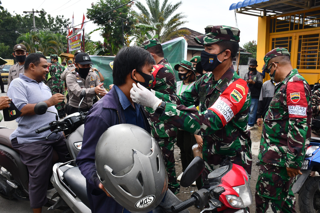 Medan, Maspolin.id—Kapendam I/BB, Kolonel Inf Zeni Djunaidhi, SSos, MSi, bersama sejumlah Perwira Staf dan personel Penerangan Kodam I/BB menggelar Operasi Yustisi Pendisiplinan Protokol Kesehatan Covid-19 di lokasi TMMD ke-109 Kodim 0201/BS Medan di Jln Marelan VII, Kelurahan Tanah Enam Ratus, Kecamatan Medan Marelan, Kota Medan, Sumatera Utara, Kamis (8/10/2020).