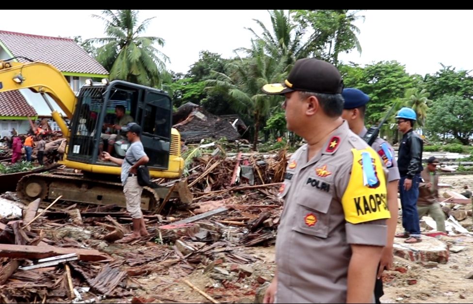 Kapolri Jenderal Pol. Tito Karnavian juga turut hadir untuk memantau langsung lokasi terdampak didampingi Kapolda Banten Brigjen Pol Tomsi Tohir di Desa Sukarame, Carita-Pandeglang, Minggu (23/12/2018) sore tadi.