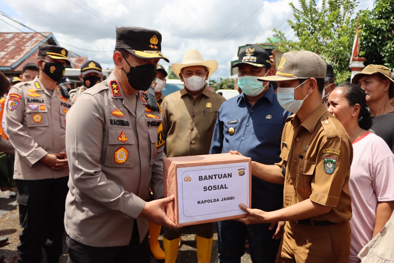 ” Pak Kapolda berikan bansos yang diterima kepala desa dan Pak Bupati Bungo di lokasi banjir,” ujarnya.
