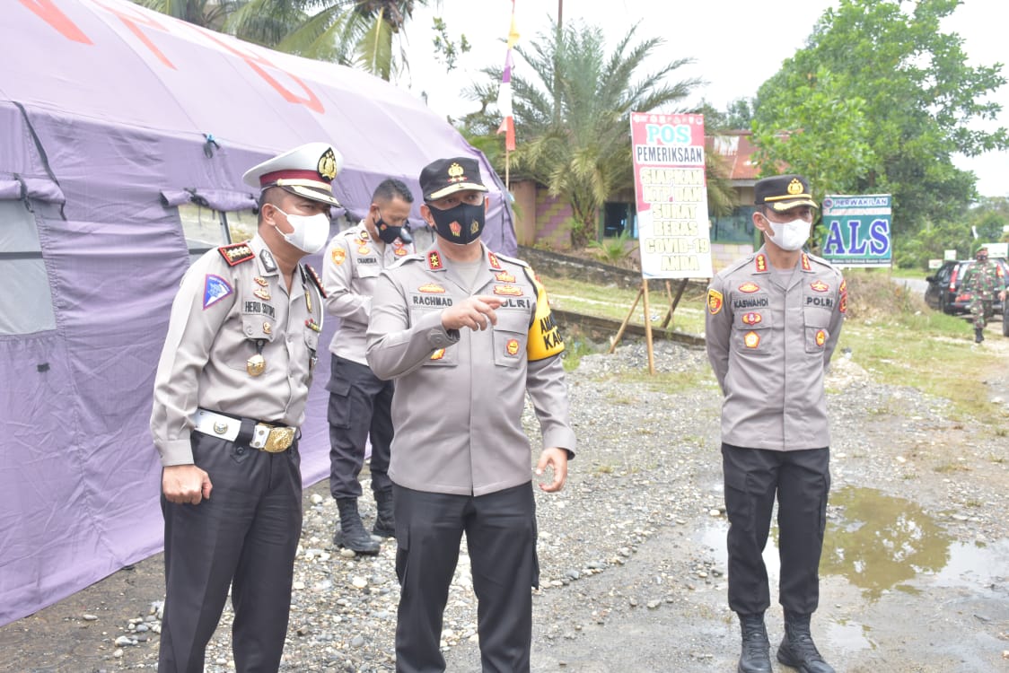 Jambi, Maspolin.id—Kapolda Jambi, Irjen Pol A. Rachmad Wibowo meninjau kesiapan pos penyekatan arus mudik lebaran tahun 2021 perbatasan Jambi – Sumatera Barat di Jalan Lintas Sumatera KM. 50, nomor 01, Rantau Ikil, Kecamatan Jujuhan, Kabupaten Bungo. Jum’at (30/4/2021) siang.