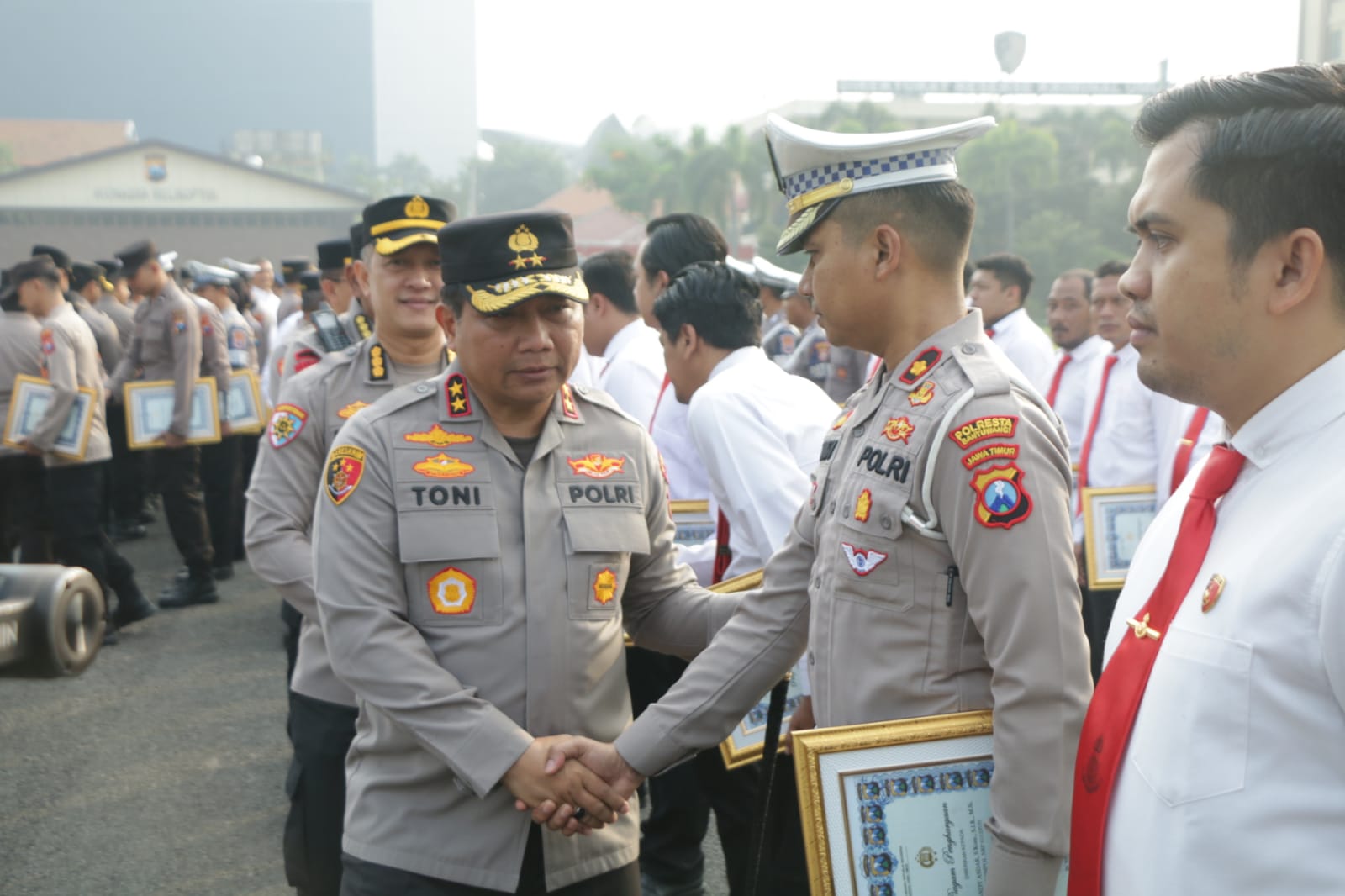 “Saya ucapkan selamat dan apresiasi kepada anggota Polri dan PNS Polda Jatim serta jajaran yang berkesempatan menerima penghargaan hari ini,”ungkap Irjen Toni.