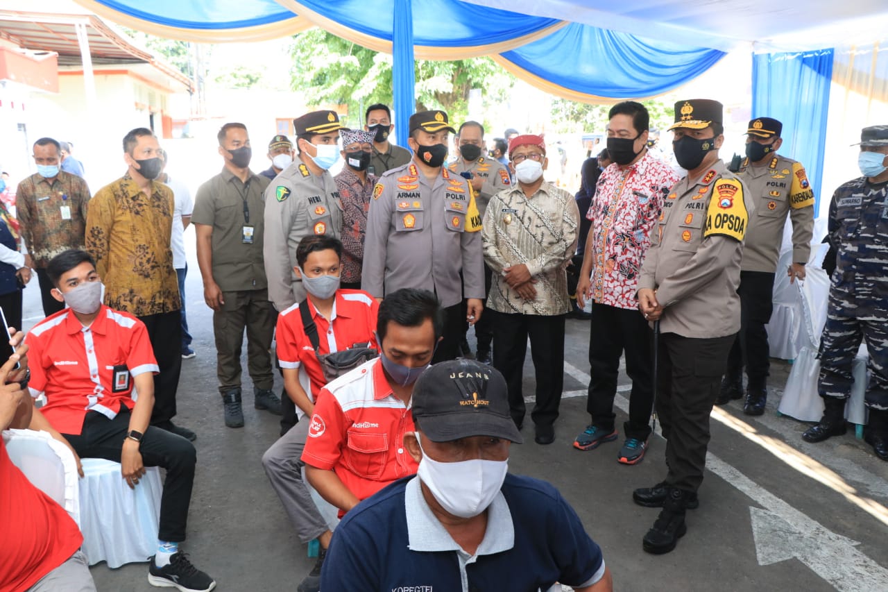 “Saya bersama Kapolresta Banyuwangi, melakukan pengecekan vaksinasi untuk layanan publik, yang hari ini dijadwalkan untuk pegawai Telkom, sejumlah 254 orang,” jelas Kapolda Jawa Timur, Irjen Pol Nico Afinta usai keliling memantau situasi vaksinasi.