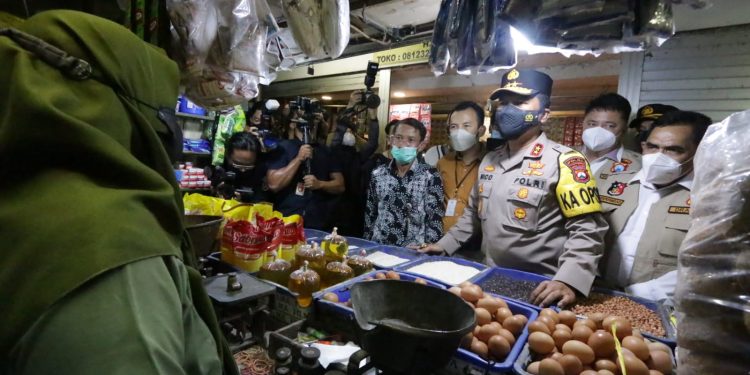 Kapolda Jatim bersama Forkopimda dan Satgas Pangan Jatim Cek Ketersediaan Minyak Goreng Curah dan Kemasan di Pasar Wonokromo