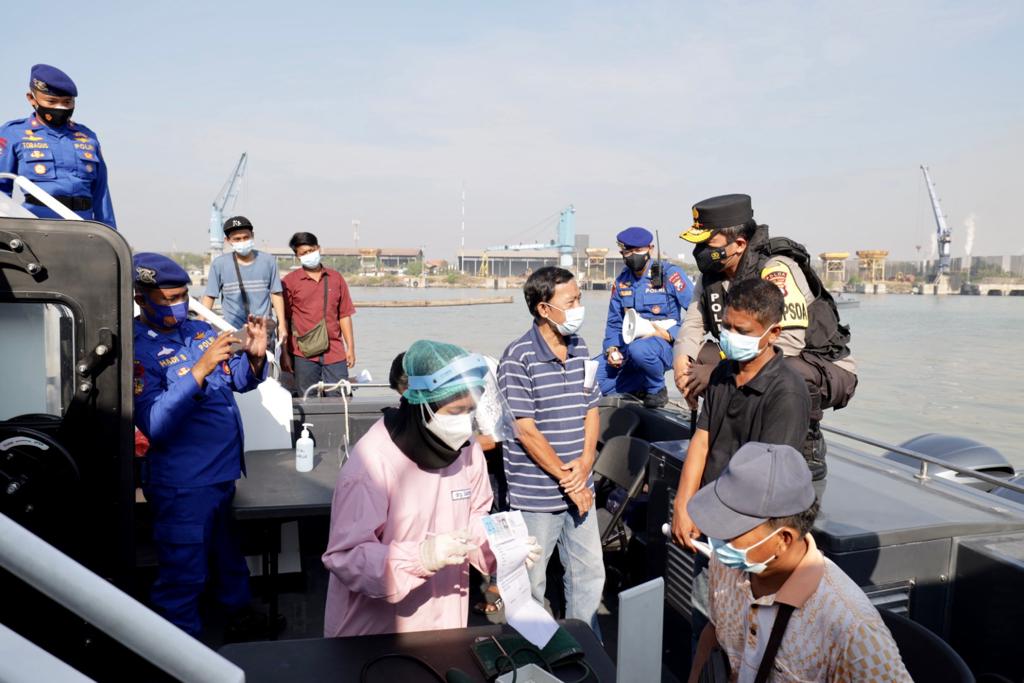 MASPOLIN || SURABAYA – Kapolda Jawa Timur bersama Pejabat Utama Polda Jatim, melakukan pengecekan vaksinasi yang belangsung di atas kapal dan di Dermaga. Hal ini dilakukan Direktorat Polisi Air Udara (Polairud) Polda Jatim, dalam percepatan vaksinasi bagi masyarakat nelayan dan pesisir di dermaga Kroman Gresik, pada Selasa (3/8/2021).