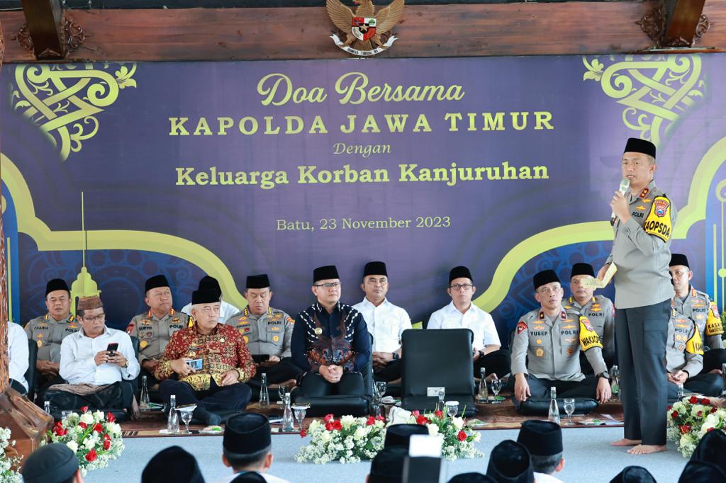 BATU – Maspolin.id|| Kapolda Jawa Timur Irjen Pol Drs. Imam Sugianto,M Si didampingi Waka Polda Jatim Brigjen Pol Akhmad Yusep Gunawan serta pejabat utama (PJU) Polda Jatim dan Forkopimda se Malang Raya menggelar doa bersama dengan keluarga korban tragedi Kanjuruhan di Pendopo Rumah Dinas Walikota Batu, Kamis (23/11/23).