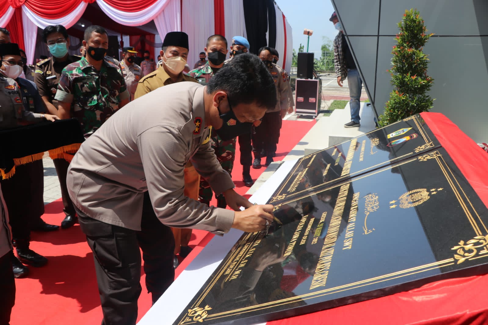 maspolin.id, Gresik – Kapolda Jawa Timur Irjen Pol Nico Afinta bersama sama Staf Ahli Bid Ekonomi Kodam V/Brawijaya Kol Inf Parawita Agus, Forkopimda Kabupaten Gresik, Ketua FKUB Gresik, Ketua PD Muhammadiyah Gresik, Ketua DMI Gresik, Ketua Formagam Gresik, Perwakilan PT. Petrokimia Gresik, Perwakilan PT. Wilmar Nabati Indonesia, Perwakilan JIIPE serta Pejabat Utama Polda Jatim, Selasa (29/3/2022) siang, meresmikan Masjid AL-Aziz, Rumah Tahanan Polres Gresik dan Gedung Aula Wicaksana Laghawa, yang ditandai dengan pemotongan pita serta penandatanganan prasasti.